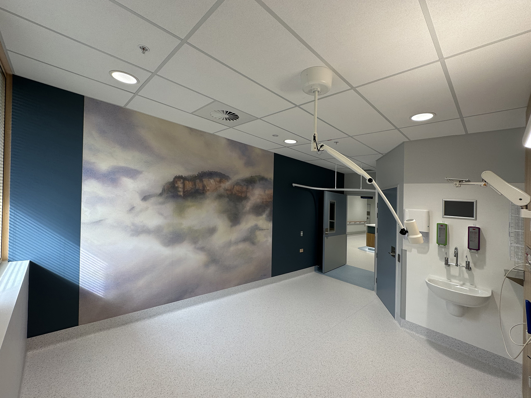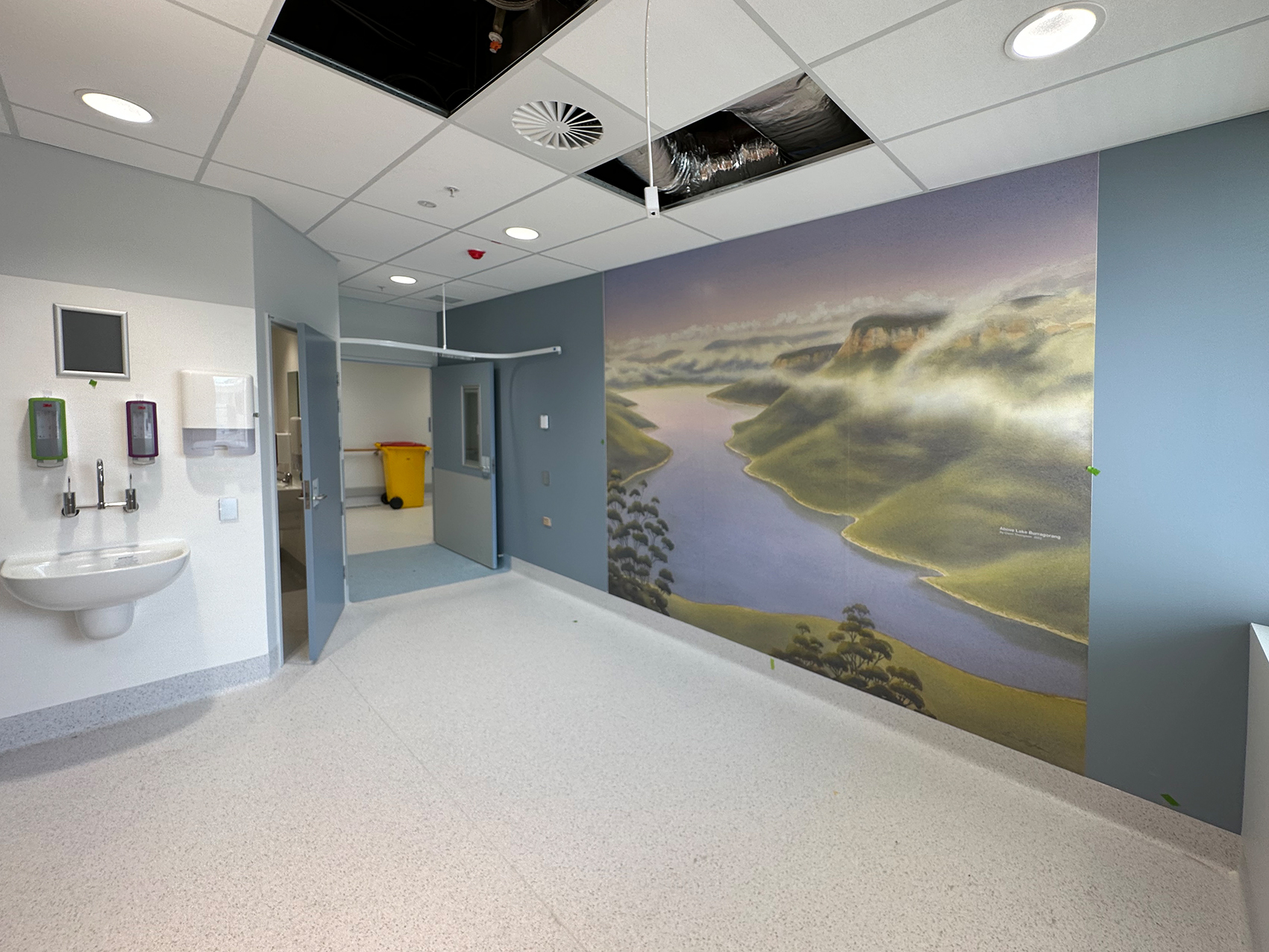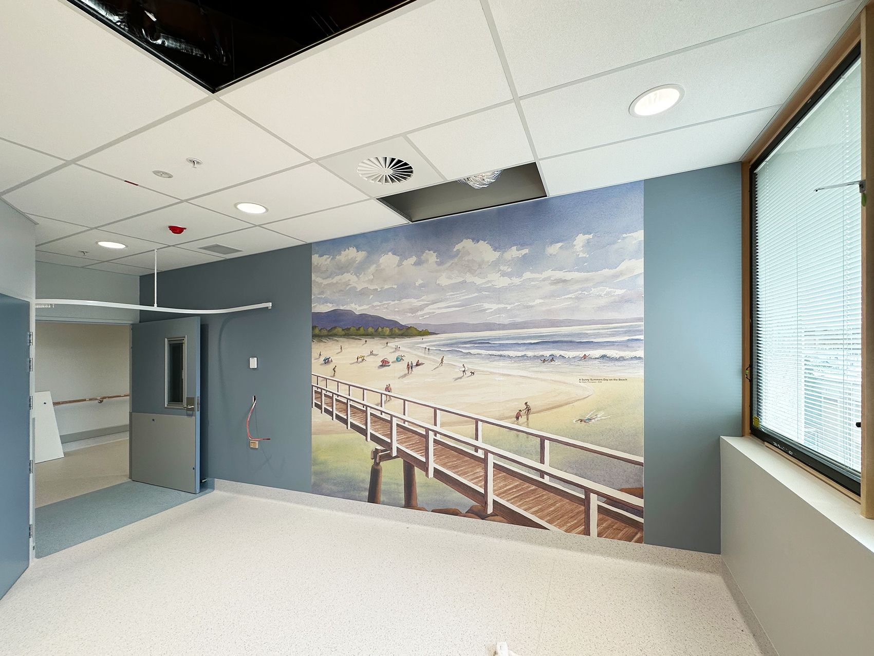 Malcolm Cooke had the originals works scanned at high res and the digital files were then enlarged to fit the intended area. The work was then fabricated in floor to ceiling wall vinyls for the 12 Isolation bedrooms and the 28 inboard bedrooms.