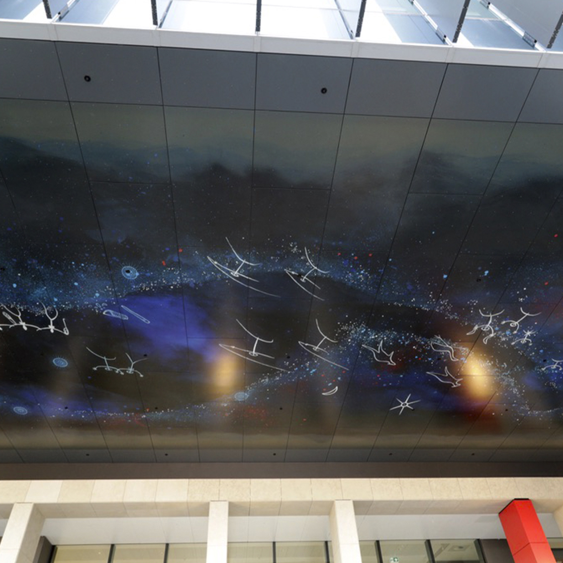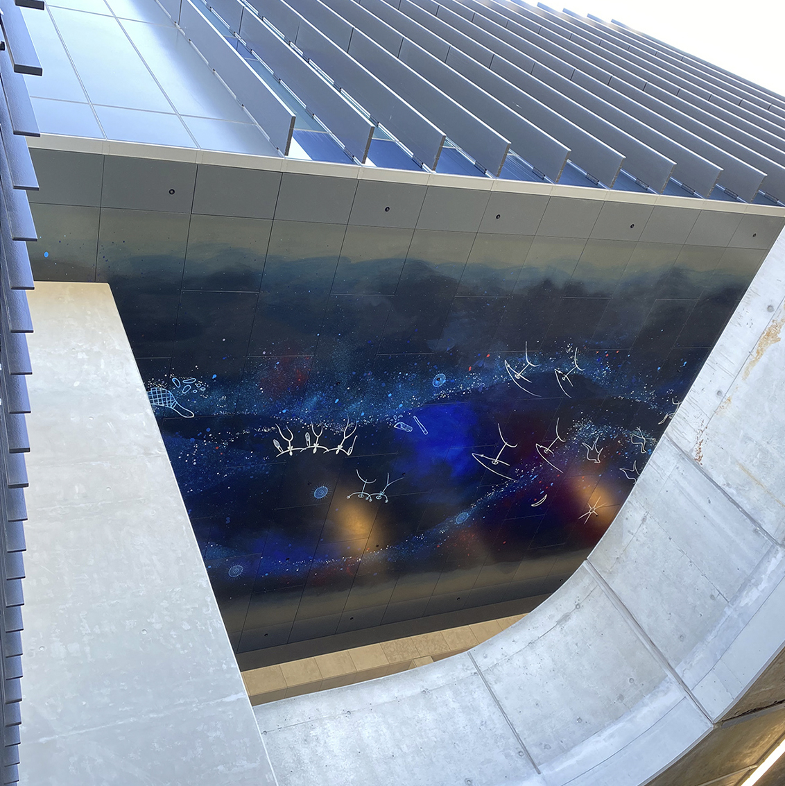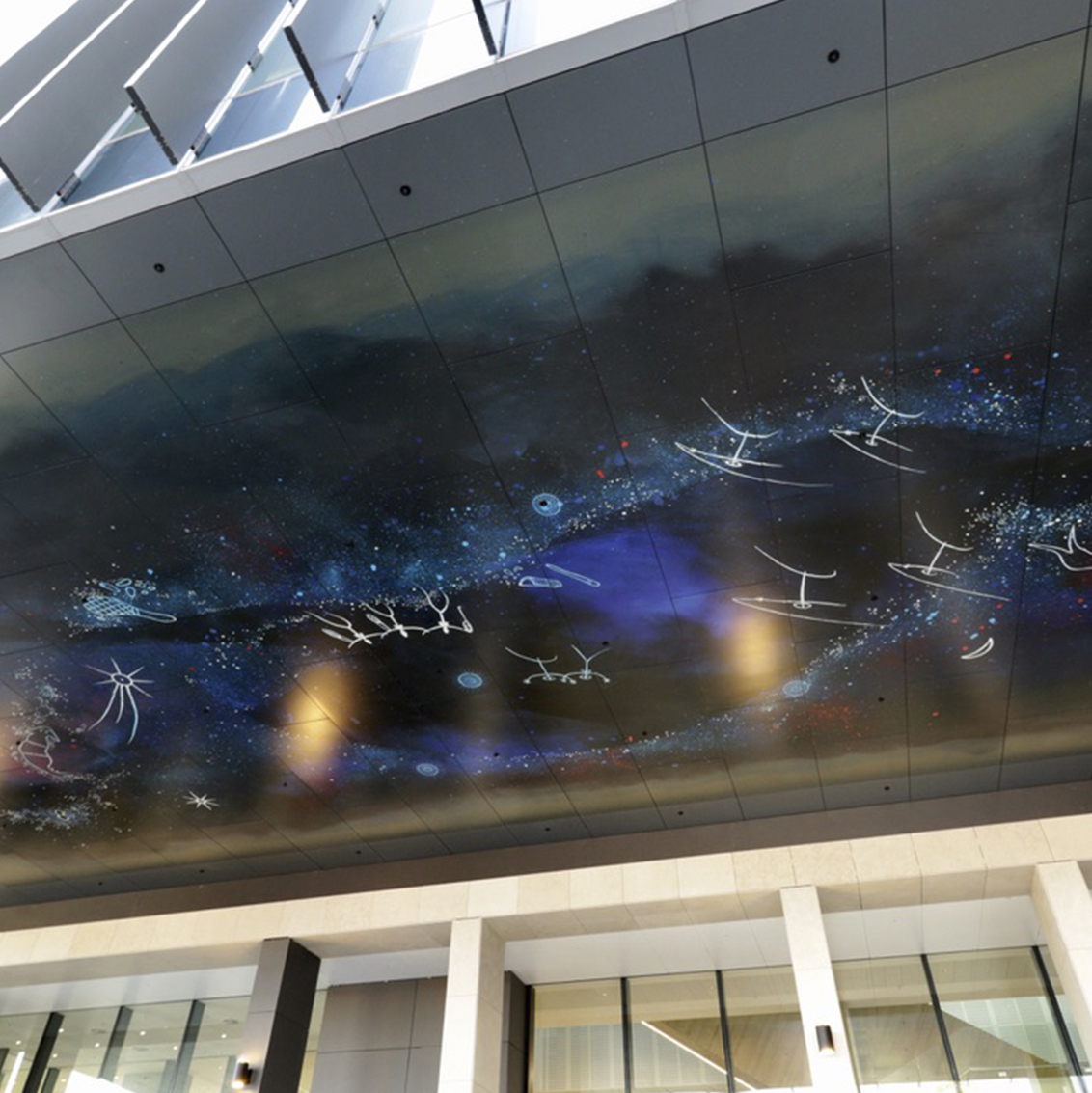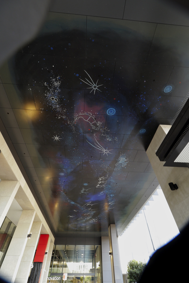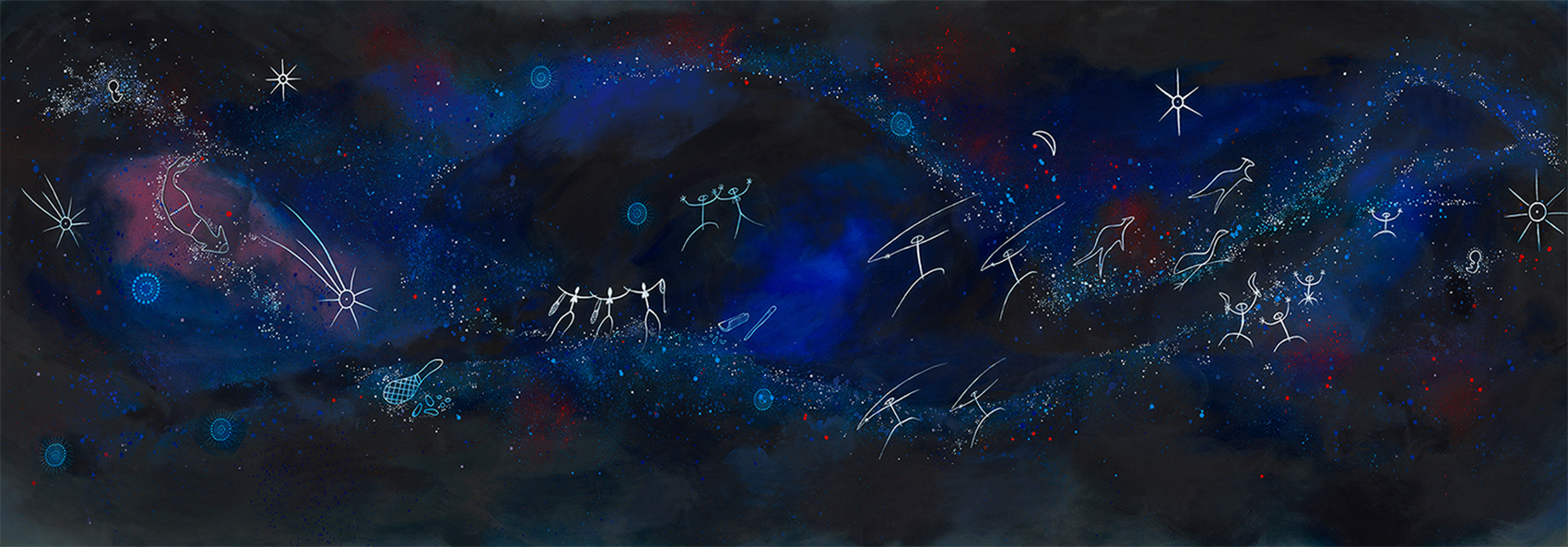 The Dharug people from the Greater Sydney region shared night sky stories with many other Aboriginal nations and some of the star stories such as the Seven Sisters story (Pleiades constellation) have songlines that are shared right across Australia and beyond. ‘Gumadagu Gurang-Home of the Ancestors’ depicts known Dharug beliefs and stories of the night sky. The stars are the twinkling of the various campfires of the Ancestors as they go about their daily lives - a reflection of life on earth.